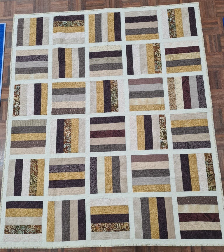 We met last week for the second July meeting, and it was a big one. Most of our members were there, and we also had a lot of quilts donated to us. The first thing we do is have lunch, and when its a big meeting, we have to push several tables together so that we can all fit around it. It was a bit like herding cats last week - everyone wanted a chat.